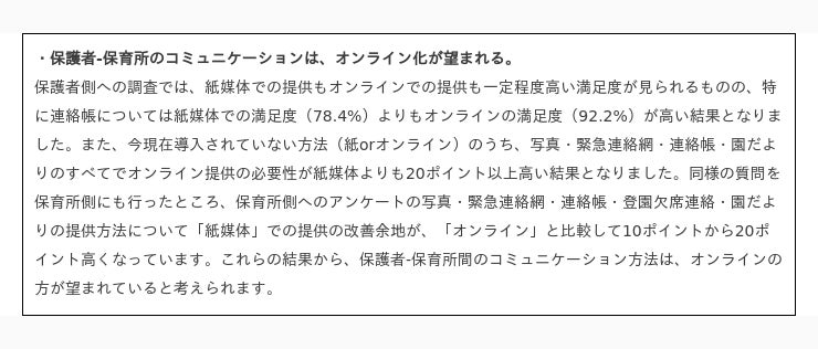 ┗ 保護者-保育所のコミュニケーションについては、オンライン化が望まれる。
