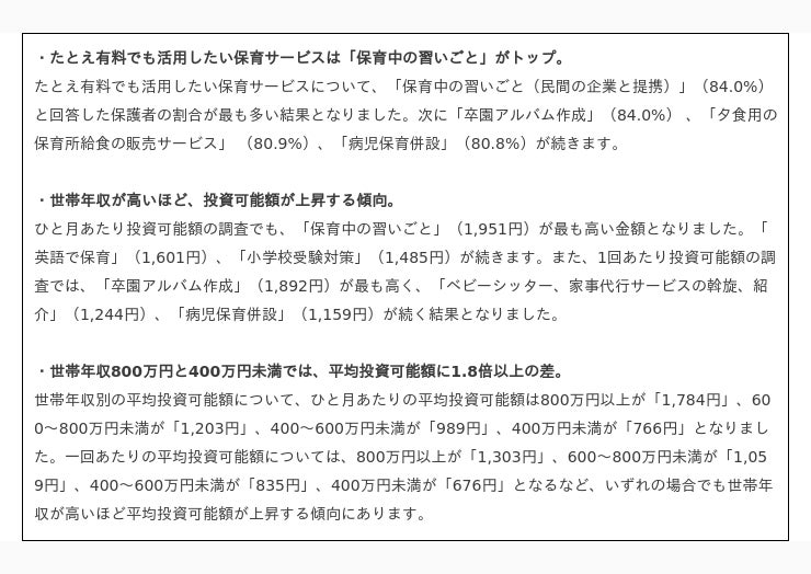 ┗ たとえ有料でも活用したい保育サービスは「保育中の習いごと」がトップ。