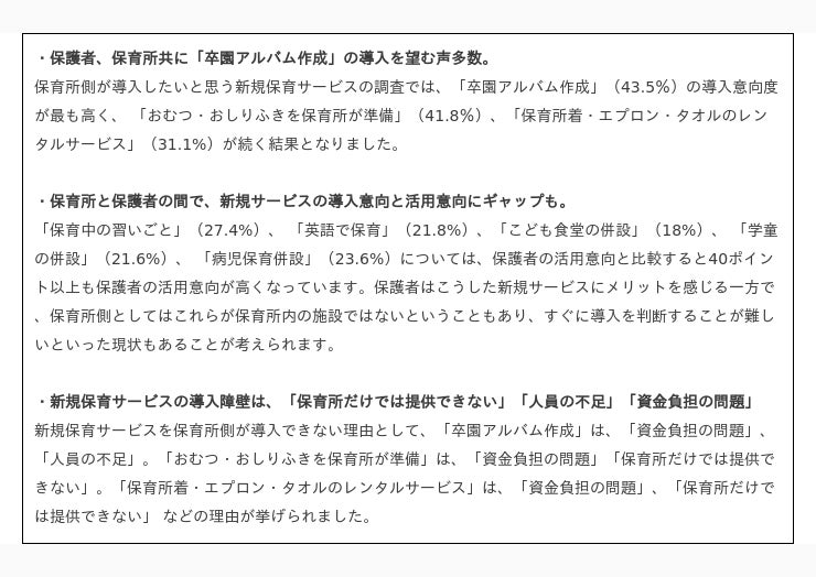 ┗ 保護者、保育所共に「卒園アルバム作成」の導入を望む声多数。