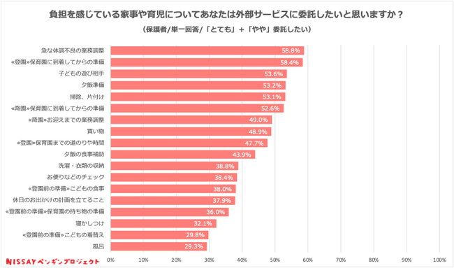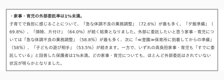子育ての負担については、子どもの体調不良による仕事の調整のほか、食事や掃除などの家事で高く、外部への委託希望も半数を超えていましたが、実際に委託している割合はごくわずかでした(1%未満)。希望と現実にギャップのある背景には、「母親が子どもの面倒を見るべき」といった昔ながらの価値観が根強くあることや、経済的余裕の無さ、供給不足といった要因があるのでしょう。