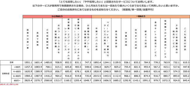 Q.「とても活用したい」「やや活用したい」と回答されたサービスについてお伺いします。以下のサービスが保育所で有償提供される場合、ひと月あたりまたは一回あたり最大いくらまでなら支払って利用したいと思いますか。ご自分のお気持ちにあてはまるものをお知らせください。(保護者)