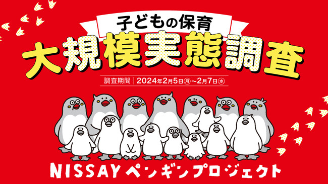 日本生命保険相互会社(以下「当社」)は、子育ての壁や不安のない社会を作ることを目指す「NISSAYペンギンプロジェクト」の一環として、全国の保護者と保育所で働く方を対象に、『子どもの保育 大規模実態調査』を2024年2月5日(月)~ 2月7日(水)の期間で子どもを保育所に預けている保護者、および保育所関係者向けに実施いたしましたので、その結果をご報告いたします。