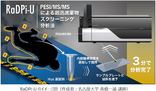 近畿大学生物理工学部(和歌山県紀の川市)生命情報工学科教授 財津桂(研究実施当時、名古屋大学)、愛知県警察本部科学捜査研究所(愛知県名古屋市)主任研究員 久恒一晃、国立研究開発法人 産業技術総合研究所(茨城県つくば市)主任研究員 井口亮、名古屋市衛生研究所(愛知県名古屋市)研究員 谷口賢、金城学院大学生活環境学部(愛知県名古屋市)講師 浅野友美らの研究グループは、尿から薬物を迅速に分析できる新手法「RaDPi-U(ラドパイ-ユー)」を開発しました。この手法は、煩雑な試料調製や専門性の高い装置の操作などが一切不要で、たった3分で尿試料から直接40種類の薬物を分析できます。従来法と比べて、非常に迅速かつ簡便でありながら、信頼性の高い分析結果が得られるため、今後、薬物犯罪捜査や急性薬物中毒の薬物分析などに大きく貢献できます。