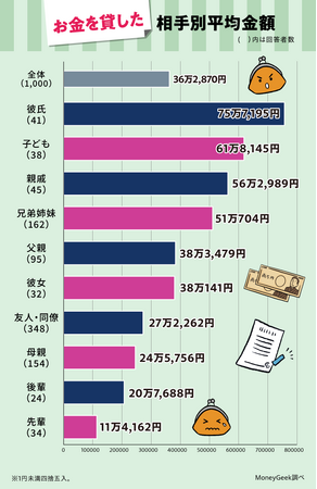 お金を貸した相手別平均額の1位は「彼氏」