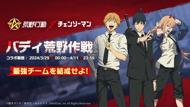 NetEase Gamesが開発・運営する大人気バトルロワイヤルゲーム『荒野行動』にて、2024年3月29日0:00から2024年4月11日23:59の期間中、TVアニメ『チェンソーマン』とのコラボイベント第2弾を開催いたします。