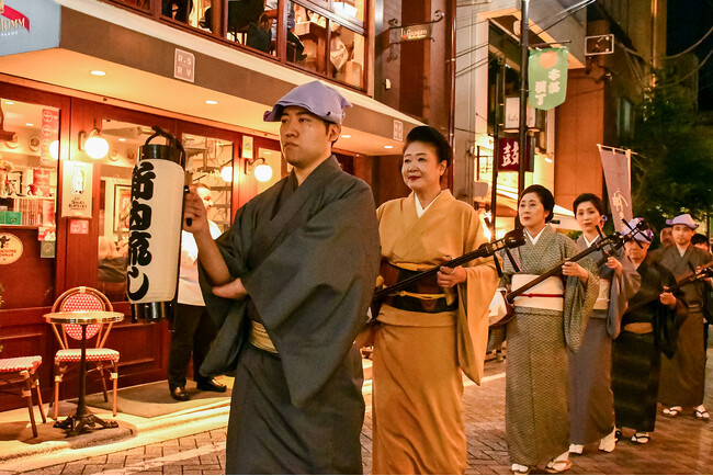 石畳の路地に迷い込むと聞こえてくる三味線の音色。偶然のように出逢う“流しの芸能”。地元神楽坂在住で新内節の人間国宝・鶴賀若狭掾(わかさのじょう)一門による粋な姿の「新内流し」が、神楽坂の路地や横丁を流します。哀愁漂う曲調に静かに耳を傾けてみてください。