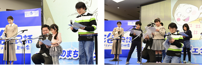 「海ノ民話のまちプロジェクト」アニメ監督の沼田心之介さんと、作品に命を吹き込む声優の方々とのトークショーの前半は、海ノ民話アニメーションの声を務める四宮豪さん、冨田泰代さんが登壇しました。