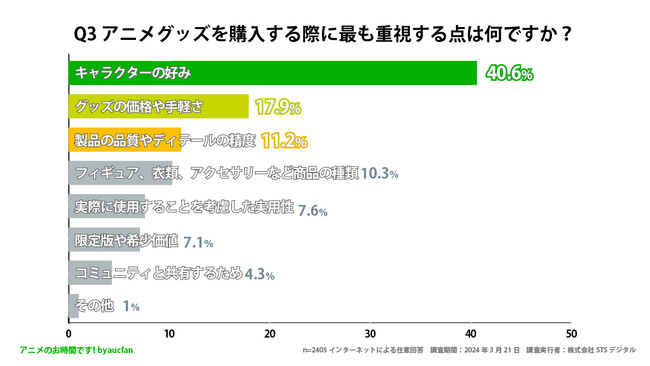 Q3 最も多かった回答が「キャラクターの好み」で40.6%、次点で「グッズの価格や手軽さ」が17.9%と回答されました。