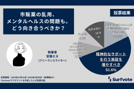 SNSとテクノロジーで社会課題の発見・解決をサポートするPolimill株式会社(ポリミル、本社:東京都港区、代表取締役:横田えり、以下Polimill社)はこのたび、「少女たちによる市販薬の乱用、メンタルヘルスの問題も。どう向き合うべきか?」というイシュー(課題)について2月28日に投票が終了しましたので結果をお知らせします。