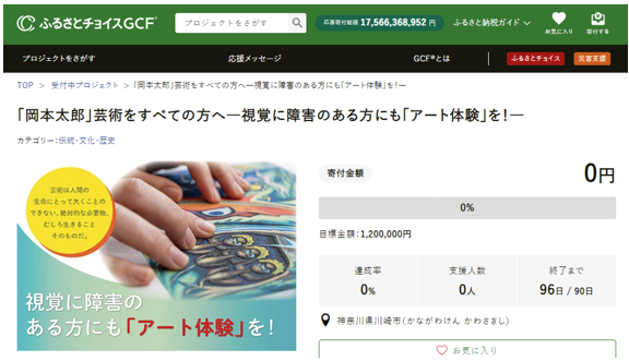神奈川県川崎市(市長:福田紀彦、以下「川崎市」)と国内最大級のふるさと納税総合サイト「ふるさとチョイス」( https://www.furusato-tax.jp/ )を企画・運営する、株式会社トラストバンク(本社:東京都品川区、代表取締役:川村憲一、以下「トラストバンク」)は、本日4月2日、トラストバンクが提供する、ふるさと納税制度を通じてクラウドファンディング型で寄付を募る仕組み「ガバメントクラウドファンディング(R)」(以下「GCF(R)」)で、視覚に障害をお持ちの方に安心して川崎市岡本太郎美術館に来館いただき、アート体験をしていただくことを目的としたプロジェクトを開始します。募集期間は2024年4月2日~6月30日で、目標寄付金額は120万円です。