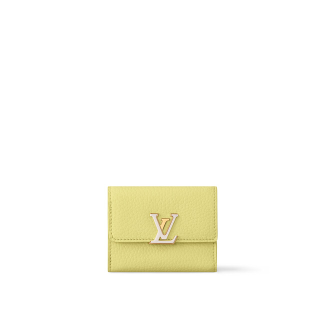 グレイン(しぼ)のある柔らかなトリヨンレザーで仕立てた「ポルトフォイユ・カプシーヌ XS」。「カプシーヌ」シリーズを象徴するゴールドカラーのLV シグネチャーの留め具が、デザインを引き立てます。エレガントな外装と実用的でスマートな内装を組み合わせた、小ぶりの財布です。大ぶりのフラットポケットと5つのカードスロットに加え、サイドにはファスナー付きコインポケットを備えています。