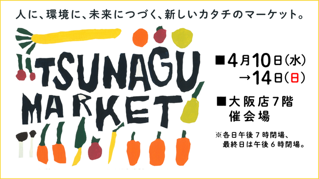 その象徴的な催しとして、4月10日(水)から5日間、7階催会場で「TSUNAGU MARKET」を開催します。今回のテーマは「People&Local」。障がいのある人とともに作る雑貨や、大阪の街に受け継がれてきた技術など、「ヒトとマチ」のパワーを感じる商品が一堂に集結します。キービジュアルの制作は奈良県の福祉施設「たんぽぽの家アートセンターHANA」の青木 優 氏が担当。福祉施設との協創や大阪製ブランド認定企業10社の商品、体験型ワークショップ、伝統楽器の音楽イベントなど、個性豊かなヒトとマチを身近に感じるソーシャルイベントです。