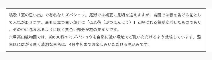 六甲山観光株式会社(本社:神戸市灘区 社長:寺西公彦)が運営する六甲高山植物園では、春の訪れを告げる花「ミズバショウ」の群落が見頃です。