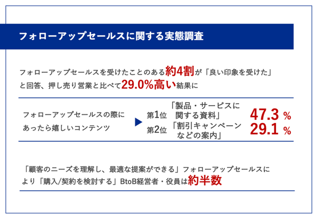 まず、フォローアップセールスを受けた経営者・役員の約4割が「良い印象を受けた」と回答しており、押し売り営業と比べて29.0%も印象が良い実態が明らかとなりました。特に、フォローアップセールスが「顧客のニーズを理解し、最適な提案ができる」ことが高く評価され、そのようなフォローアップであれば製品やサービスの購入・契約を検討するとの回答が44.5%にのぼりました。また、「製品やサービスに関する知識が豊富」であること、「親しみやすくコミュニケーションが取りやすい」ことも、フォローアップセールスの重要な要素として挙げられており・・・調査結果全文をご覧になりたい方は、下記ボタンよりダウンロードください。