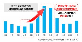 例年、エアコンのお問い合わせや点検のご依頼は、エアコンを使い始める6月頃から増え始め、7月、8月 に集中します。混雑により暑い時期に修理対応をお待ちいただく場合があるため、本格的に暑くなる前の4月~6月前半に試運転を行い、早めに準備を済ませていただくことをご提案しています。
