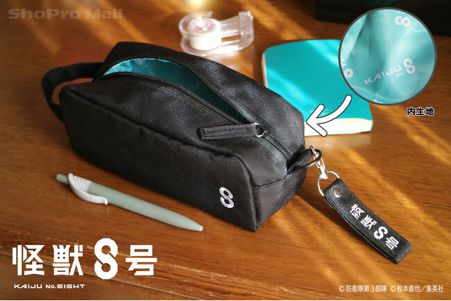 『怪獣8号』のアニメロゴを刺繍、プリントで表現したシンプルなデザインのポーチです。ペンケース、コスメポーチとして日常使いしやすい仕様になっています。外はブラックで落ち着いたデザインに、内生地はアニメ『怪獣8号』の象徴的なカラーであるエメラルドグリーンのロゴ総柄になっています。