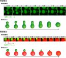 エンドソームの融合には、2つのエンドソーム(緑色)が急速に合体して1つの小胞になる同型融合(上段)と、エンドソームがゆっくりとリソソーム(赤色)に吸収されていく異型融合(下段)があることが分かった。この2種類の融合は、力学モデルを用いた数理解析で予想されたものとよく似ていた。