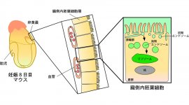 妊娠8日目のマウス胚を蛍光物質で標識した後、臓側内胚葉細胞を顕微鏡観察すると、細胞外から取り込まれた物質が、初期エンドソーム、後期エンドソームを経てリソソームへ運ばれる様子が観察された。