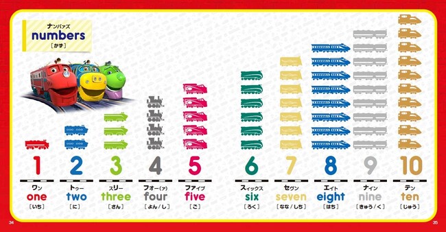 アルファベット、いろ、かず、電車にまつわる英単語、簡単なあいさつまで、チャギントンのなかまたちとあそびながら自然と英語を覚えられる一冊です。