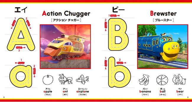 アルファベットページでは、チャギントンのキャラクターたちとともに、A~Zまでの大文字、小文字の書き順、関連する単語が構成されています。