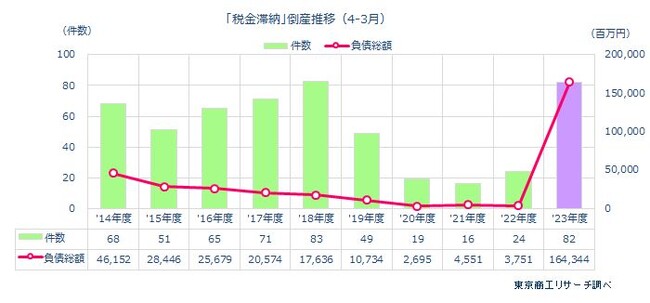 2023年度(4-3月)に「税金滞納(社会保険料を含む)」に起因する倒産が82件(前年度比241.6%増)と前年度の3.4倍に急増、コロナ禍後で最多を記録したことがわかった。