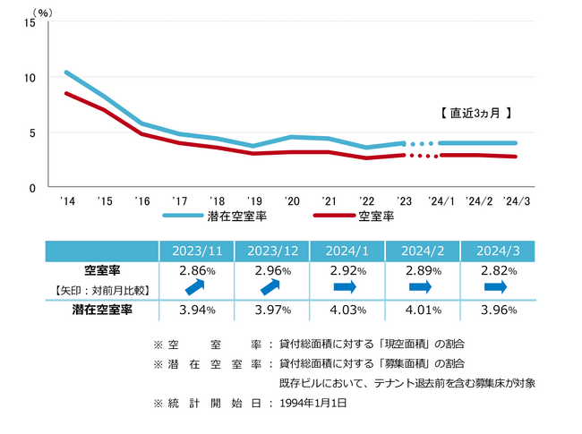空室率は前月比マイナス0.07ポイントの2.82%となり、前月から小幅に低下した。主要エリア内の新築ビルを中心に空室消化が進んだ。潜在空室率は前月比マイナス0.05ポイントの3.96%となった。