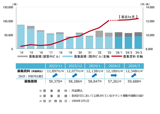 募集賃料は前月比プラス168円/坪の12,348円/坪となった。11ヵ月連続の上昇となり、統計開始以来の最高値更新が続いている。既存ビルでは従前より高い賃料水準での成約が増えている。