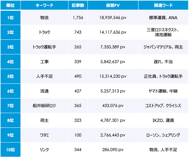9位のワタミは、4月から物流分野でローソンと連携すると発表しました。業界を超えた連携で「2024年問題」に対応するということで、多くのPVを得るニュースになりました。ローソンの店舗に商品を配送するトラックが、非稼働時間にワタミの食事宅配サービス「ワタミの宅食」の商品を運びます。