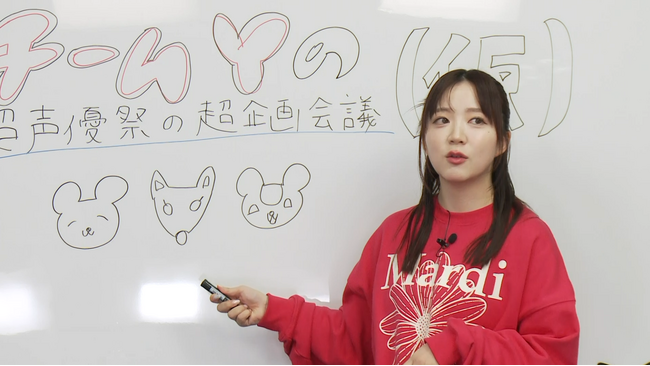 最初の議題は、イベント来場者へのプレゼントとなるトートバックのロゴ作成について。視聴者にコンセプト案などを聞きながら進めていきました。「(3人をイメージした)それぞれの動物の絵文字が良い」「名前を入れてほしい」「歌ってみたのサムネ風が良い」などの意見やアイデアを聞きながら、書記を担当する伊藤がホワイトボードに次々とイラストを書いていきました。「カラフルだと嬉しい」のコメントに対して3人も共感していると、番組運営スタッフから単色との発言が。「ちょっと待ってください、その情報一番初めに言わなきゃダメじゃないですか!変わるよ、単色とカラーで!」と全力でツッコむ伊藤。視聴者からも「おいおいwww」「そこ言ってよw」などのツッコミが殺到しました。最終的には3人の名前や動物、食べ物などを全て入れたデザインに決定しました。