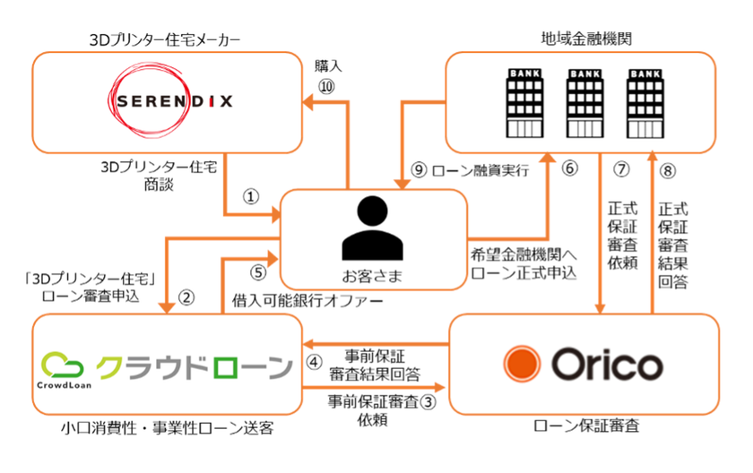 一方で、新しいテクノロジーであり国内で実績の少ない3Dプリンター住宅には、適用される住宅ローンがなく、購入するうえで大きな制約となっていました。オリコとセレンディクスは、この課題に対して、「より自由に家を購入できる社会の実現」を目指して協力し、今後の本格的な量産化に先駆けて「3Dプリンター住宅ローン」を商品化いたしました。