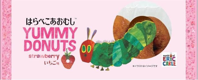 商品特徴:絵本に出てくるはらぺこあおむしが好きないちごの味を再現した、とちおとめ果汁入りのドーナツです。
