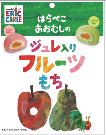 商品特徴: 絵本に出てくるあおむしの顔と体をイメージした、緑色(梨味)と赤色(林檎味)が入ったジュレ入りのアソートフルーツもちです。