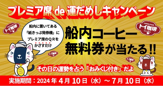 本キャンペーンは、期間中に「あおい」と「りつりん2」の両船のプレミア席をご利用頂くお客様を対象に、抽選で船内コーヒー1杯無料券をプレゼントするものです。抽選確率は毎回50分の1。