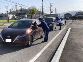 2024年4月10日(水)は、全国的に「交通事故死ゼロを目指す日」に指定されているため、大学前の交差点にて「春の交通安全啓発活動」を実施しました。歩道では横断幕で交通安全を呼び掛けるとともに、赤信号で止まっている車両のドライバーの方に、助手席からパンフレットを手渡し、交通安全運動の協力を呼び掛けました。本学では毎年「春の全国交通安全運動」実施していますが、本年度、大学前に新しく信号機が設置されたことに伴い、本学の地域貢献及び社会貢献の観点から、本学体育会と協力団体の皆様のおかげで、通勤・通学をする車両と歩行者に対して、交通安全を呼び掛ける活動に昇華させることができました。参加学生からは、「パンフレットを渡す際、ドライバーの方に応援してもらい、元気を頂きました。地域の方からのご声援に応えられるよう、さらに頑張ろうという気持ちが沸き上がり、安全運転の気持ちが高まりました」とのコメントがありました。