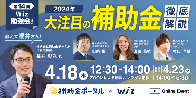 株式会社補助金ポータル(本社:東京都渋谷区、代表取締役:福井彰次)は【株式会社Wiz(本社:東京都豊島区、代表取締役社長:山崎 俊 氏)】が主催する2024年に注目の補助金について学ぶ公開型の勉強会にゲスト登壇させていただきます。