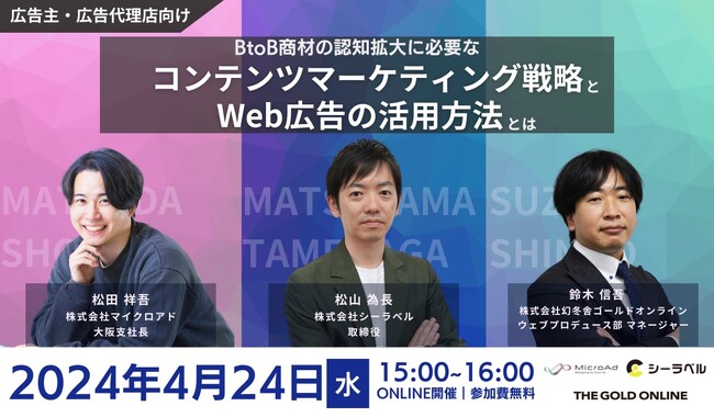 株式会社マイクロアド(本社:東京都渋谷区、代表取締役社長:渡辺健太郎、以下 マイクロアド)は、広告主・広告代理店向けに、株式会社シーラベル、株式会社幻冬舎ゴールドオンラインとともにオンラインセミナーを開催いたします。