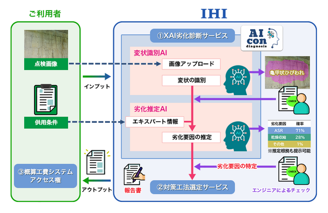 IHIグループでは,このAIcon診断(R)による出力を専門家がチェックし,さらに推定された劣化要因や運用条件にあった適切な対策工法をご利用者様に提示する受託サービスを開始しました。また,本受託サービスのアウトプット(報告書)を踏まえ,ご利用者様が予算規模や現場条件に応じた概算工費を算定できる「概算工費システム」のアクセス権の提供も併せて開始しています。これらはご利用者様のニーズに合わせ,下図に示す1.~3.までの3段階のサービスを選べることが可能です。