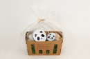 コロコロまるい親子パンダのパッケージに、パンダマシュマロとパンダボーロを詰めて、ギフトセットにしました。マシュマロは中にチョコクリームが入ったチョコマシュマロ。優しい味のボーロはパンダイラストに加えて、HAPPYメッセージのボーロも入っています。