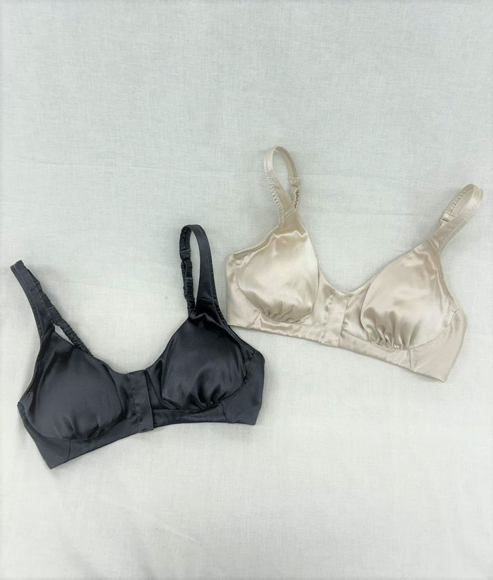 ブラジャーはノンワイヤーでフロントボタン、肌に負担も少なく締め付けも感じにくい仕様、シルクサテンの光沢の良さを引き出すため、レースなどは使用せずミニマルデザインにしあげてあります。