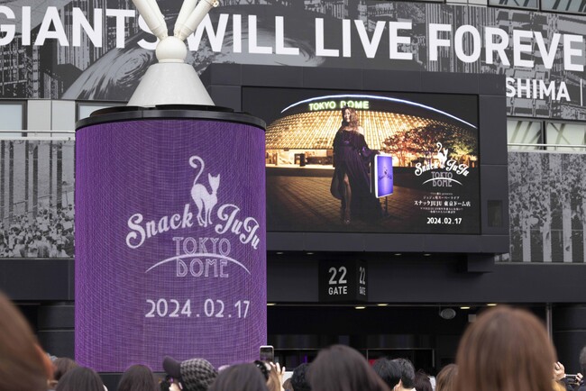 「スナックJUJU」とは、ママが来客の悩みの相談などに乗りながら、その美声で昭和歌謡などの名曲をカヴァーし、ときには客とも一緒に歌って大いに盛り上がる夜の宴。今回の水道橋店が66店舗目となり、過去最大規模となる東京ドームでの一夜限りのスナック開店となった。アリーナには、円卓が並べられ、そのプラチナチケットを幸運にも入手した客をはじめ、完売したチケットを手にする誰もが、飲食も楽しみながらママの歌声に酔いしれることもできるという趣向だ。