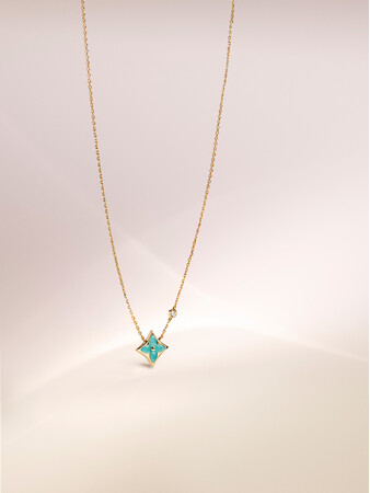 アマゾナイトは4種類のアイテムでデビュー。ペンダントには、1粒のラウンドブリリアントダイヤモンドをアクセントとするシングルフラワーがイエローゴールドチェーンに吊り下げられ、同じデザインコンセプトによるシックなブレスレットにも、1粒の小さなダイヤモンドとアマゾナイトのシングルフラワーが組み合わされています。