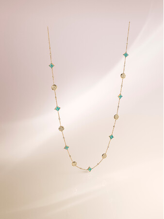 毎日の装いにぴったりなこうしたスタイルをさらに魅力的に演出しているのが、アマゾナイトとダイヤモンドパヴェのフラワーが交互に並ぶエレガントなロングネックレスとブレスレットのステートメントピース。ロングネックレスは特にプレシャスで両サイドにアマゾナイトとダイヤモンドのフラワーがセットされています。