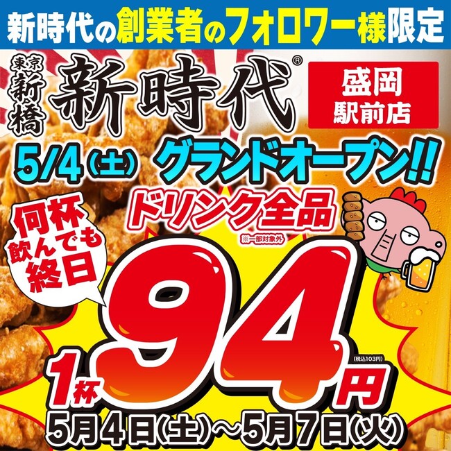 【5月4日(土)~5月7日(火)は、更にお得!】新時代の創業者のInstagramをフォローするだけで、何時でも、何杯飲んでも、ドリンク全品1杯94円のお得なセールを開催します!