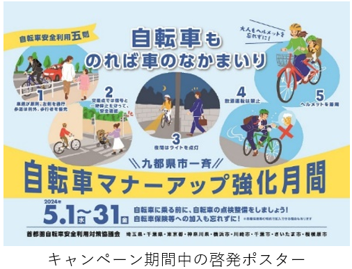 本キャンペーンは、九都県市(※)による一斉自転車マナーアップ強化月間の取組として位置づけられています。