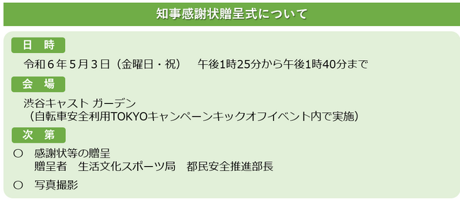この機会に、都民の皆様にヘルメット着用を始めとした自転車安全利用のためのルール・マナーについて広く訴えていきます。