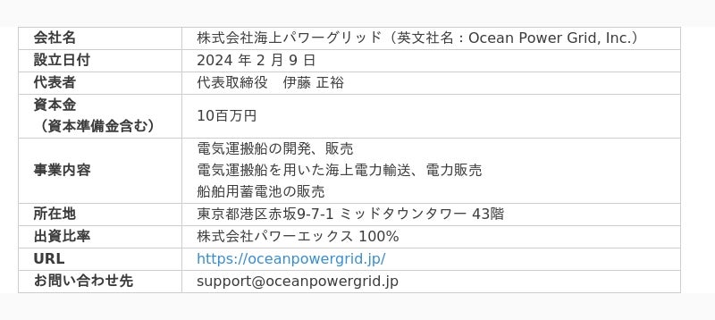 自然エネルギーの普及並びに蓄電、送電技術の進化において新規事業を展開する株式会社パワーエックス (東京都港区、取締役兼代表執行役社長 CEO:伊藤 正裕) は、2月9日、完全子会社として株式会社海上パワーグリッド(本社:東京都港区、代表取締役:伊藤 正裕、英文社名:Ocean Power Grid, Inc.)を設立しました。海上パワーグリッドは、当社が展開してきた船舶・風力発電事業部と保有する専門技術の移管を受け、今後、電気運搬船を活用した海上送電事業のさらなる推進に取り組んでいきます。