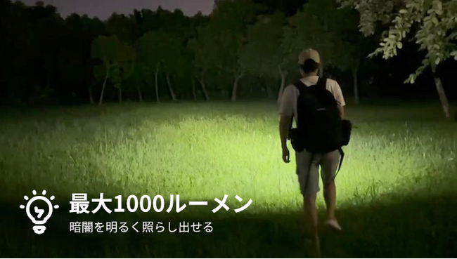 超高輝度Philips LEDを搭載し、最大1000ルーメンの明るさで145度の広範囲を照らせます。最大120m先までの照射距離があり、足元をしっかりと確認できるため、夜間の散歩やキャンプ、災害時や停電時の広範囲な照明に便利です。