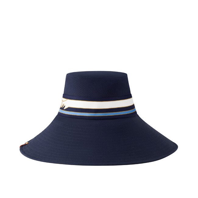 プレタポルテ・コレクションのストライプのテーマから着想を得た、シック & スポーティな「バケットハット・LV ストライプ」。セーラースタイルのストライプと船上のロープをねじって綴ったような「Louis Vuitton」シグネチャーをプリントしたシルク100%のバンドーがオールコットンのクラウンとブリム(つば)を引き立てます。ヌメ革のタグがメゾンならではの華やかな雰囲気をプラス。