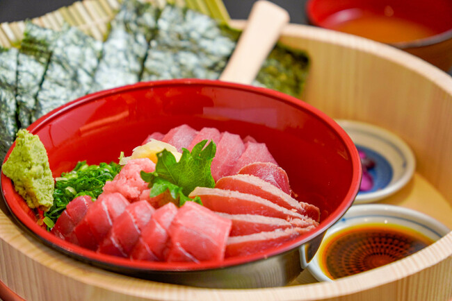 メイン商品の3種のマグロを用いた「まぐろの海商丼」をはじめ、SANKO海商(本社:静岡県浜松市中央区新貝町239-1 浜松市中央卸売市場内)のマグロの目利きが仕入れ、ベテランが加工するマグロや鮮魚をメインに、自社船を含むSANKO船団が漁獲する魚や、豊洲の大卸・綜合食品の仕入力を最大活用した海鮮をふんだんに活用した商品がラインナップされています。