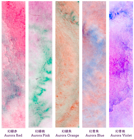 顔彩耽美グラニュレーティングカラーズは、色が分離されることで幻想的な表現ができる顔彩絵具です。不思議な顔彩絵具のことからSNSで話題となり発売初日で完売しました。カラーバリエーションは、幻緑赤(げんりょくせき)、幻緑桃(げんりょくとう)、幻緑朱(げんりょくしゅ)、幻青朱(げんせいしゅ)、幻青桃(げんせいとう)の5色です。イラストレーション、ブラッシュライティング、カリグラフィー、書画など、あらゆるアート作品にご使用いただけます。
